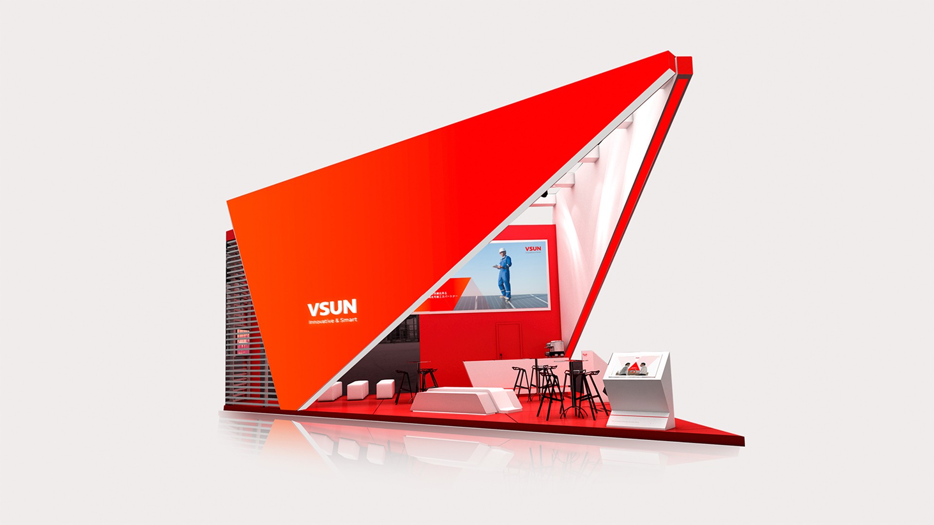 在項目初期,煥識團隊與VSUN內部團隊進行了多輪探討,在品牌對外表達的語詞上進行了明確的定義,共同提出“以光賦能,共創未來”的基本視覺理念?;谶@一視覺理念呼應了VSUN品牌在業務中為客戶定制解決方案、與客戶共同創造成就的精神。在該理念的指導下,我們針對原有字標設計進行了優化,將原始字標傾斜體角度擺正,增強了品牌視覺感官上的穩定感與信賴感。在品牌色彩的選擇上,我們重新定義了“VSUN紅”,對紅色進行色相的更新,使其紅色飽和度更高、更明亮,同時我們賦予了紅色漸變的使用,使視覺具備靈動感。在品牌輔助圖形上,我們核心形塑了專屬于VSUN的品牌圖形系統,以最穩定,最簡潔的圖形”三角形“進行演變衍生,從VSUN標識中的字母V的結構開始,以V的結構中的交叉點為原點,用相對的設計手法,形成雙三角形,代表著VSUN與客戶共同成就,共創未來的表達,基于雙三角相對的圖形邏輯,根據不同的主題進行圖形創造,形成豐富圖形語言,構成獨特獨特的形象識別。全新的品牌視覺識別系統整體看起來更加和諧,一方面展現了VSUN穩定踏實的優良品質,另一方面,也是基于三角共聯的關系形成系統化圖形語言,塑造個性系統,傳遞共創價值,為VSUN品牌注入更具現代化,更具科技感,更具時尚感的新鮮活力,賦予品牌從穩定合作到共創未來的理念。